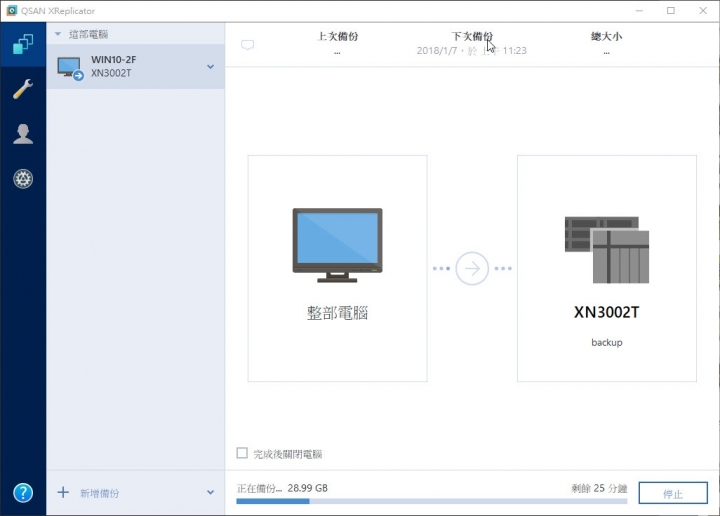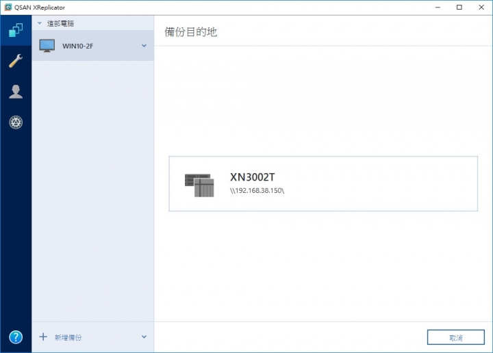 XReplicator 整機備份QSAN XCubeNAS 隨機附送 XReplicator 100U license, 其為和業界知名的 Acronis 合作的整機備份軟體.可至 QSAN 官網下載 XReplicator 軟體, 現支援 windows 系統, (以下畫面為借測版本,支援五台電腦,實際銷售版本支援100部電腦)安裝完成後, 於 NAS 建立存放 PC 備份之 share folder.多種備份模式. XReplicator 的強項即為運作中整機 Windows 備份. 並支持異機還原功能.備份目的地, 指向 QSAN NAS.指定目的地 share folder.整機備份.可以選擇整機還原或者是還原部份目錄及檔案.XCubeNAS 透過和專業的備份軟體廠商 Acronis 合作, 以支援 client to NAS 的備份功能, 優點為支援 100U 免費的整機備份功能, 另外 XCubeNAS 也可啟用 Time Machine 支援功能, 做為 Mac 備份之用.