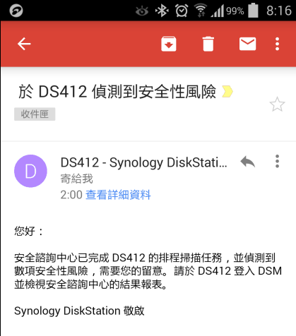 狼來了!?查遍日誌(一般、連線、檔案傳輸),結果今日零時以後都沒不良記錄。硬碟檢測都正常。DS412 只在內網運作,前面 Router 沒有任何 port forwarding、沒有 Quick connect。沒有任何 user, IP 被封鎖。請問還有什麼漏掉沒檢查的嗎?edit:好吧, 安全諮詢中心查到的結果:1 個帳號安全設定未啟動。密碼強度限制規則未達要求。2 個網路設定將導致安全性問題。ssh 連接埠為預設值。telnet 服務已啟動。反正我又不直接對外,結案。