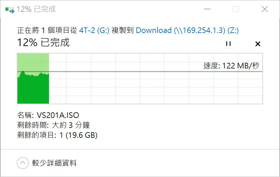▼如果是掛載網路磁碟 SAMBA,速度可以達到 120MB/s 左右,