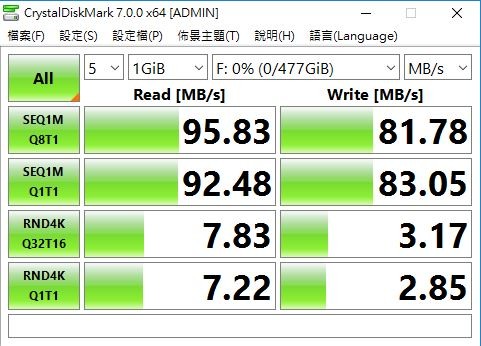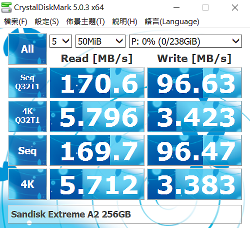 Tcell 運動用記憶卡128G (A1 V30 UHS-I), PChome 568元購買, 盒子上寫R100 W80環境: acer altos PS548-G1 (i5-8250u)讀卡機: 創建RDF5 USB3.0不愧是強調運動用,寫入很穩定,也符合A1標準不過讀取倒是.....雖然讀取沒達標,但也有85算可以啦