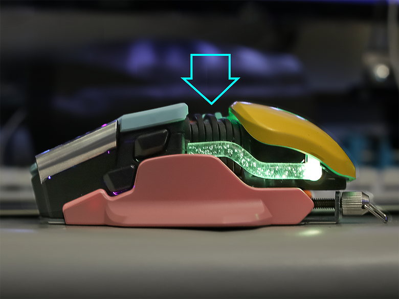 滑鼠燈效位於底部PCB板上,滑鼠放桌面時仍然能從半透明底部透出光亮。