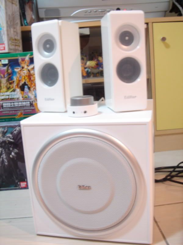 買了小白很久了一直在找一臺可以和他顏色相配的喇叭平常不玩遊戲偶爾聽聽音樂看看影集罷了買之前做了些功課本來考慮Altec 的MX5021看到大家都對他的電流聲很感冒也就不忍下手後來看到Edifier這個牌子評價都不賴價錢和外型也都滿符合我的需求所以就敗下去了開箱必備比想像中的還重登場果然很配下班回家太晚了所以不敢開很大聲重低音放地上好嘛?還是買個架子放會比較好?跟我的左右門神也很配舊愛你也撐很久了明天早上不怕吵到人在好好的來操他第一次發文請多多指教謝謝
