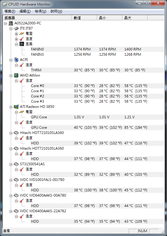 CPU:Intel p4-630 3.0GCPU散熱器:技嘉轉速可調機殼:CM 690II顯卡:px6600td一直以來只要是夏天都是這麼熱 不知道准不准進去BIOS看 溫度好像差不多之前用intel的原廠風扇 最高有到78度