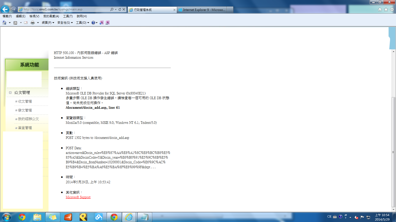 各位大大您好,小弟這次碰上另一麻煩,長期在使用的公文登入系統突然間無法使用,每當按下「存檔」鍵後,便會切到下圖畫面,跪求解法呀,有上網查過錯誤代號的意思,但也看的一知半解http://support.microsoft.com/kb/255650/zh-tw現在最麻煩的是我連問題的解決方案都不太懂截圖網頁版(圖片較大張)小圖:排版不良,傷眼抱歉!