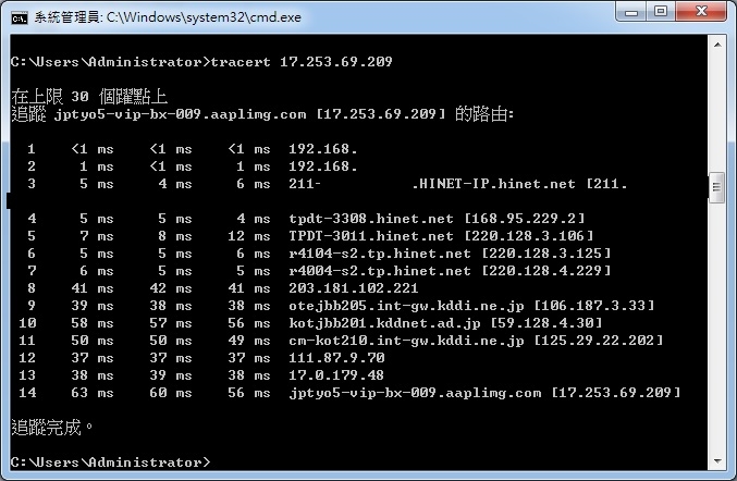 peter_yu wrote:個人認為香港5ms...(恕刪) 所以說要trace路徑確定是怎麼走的心裡才踏實阿,連到日本ping值一百多是不太正常的,速率慢也就不奇怪了,前面實驗過連到日本應該要在3.40ms。