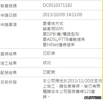 哈哈....2/26申請升雙向100M約定3/6來施工3/6包商來發現我家DJ箱下的光纖還沒拉來說沒辦法用我家左邊第三戶的光纖他說每戶外面DJ箱的光纖只能再提供給旁邊兩戶說要幫我回報請中華來拉3/6號到現在快兩個星期了中華沒半通電話今天休假打個電話去問客服人員說施工單子上寫port已滿沒辦法用我記得先前有幾位大大po過光化箱內部的相片一個模組至少都可以接到一,兩百戶(如有認知錯誤請告訴我QQ)而且我家隔壁條巷子頭尾有兩個光化箱我家這條巷子尾巴也才到71號而且我只看到一戶的dj箱下有光纖隔壁條也沒有這樣也可以插滿?因為客服也只是轉述他看到的資訊也只能讓他請申裝的人跟我連絡不過外包商回報上去中華竟然中華那邊變成這樣要照三餐打123了
