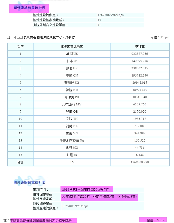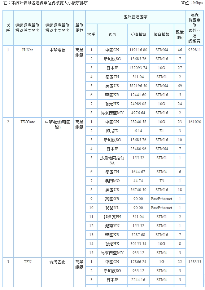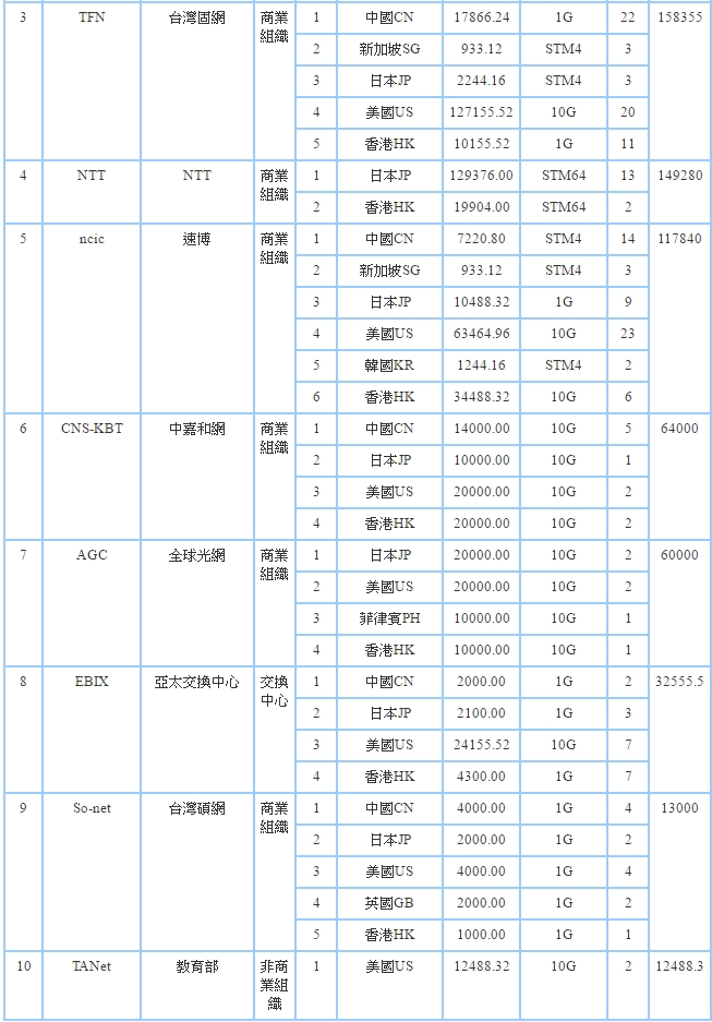 台灣各大ISP最新7月 國際(外)頻寬 排行表