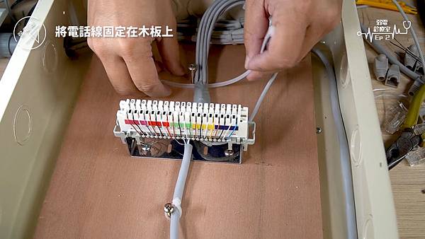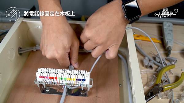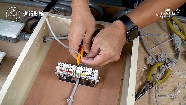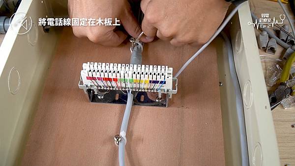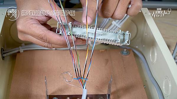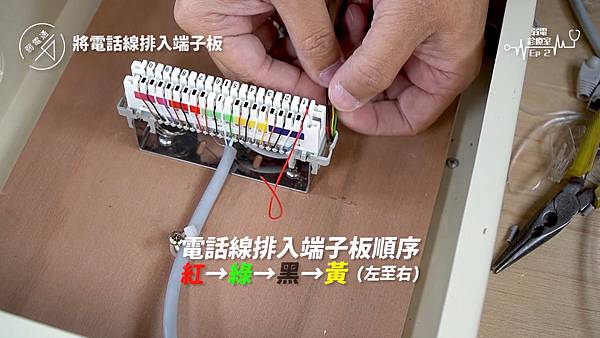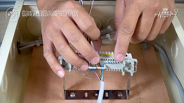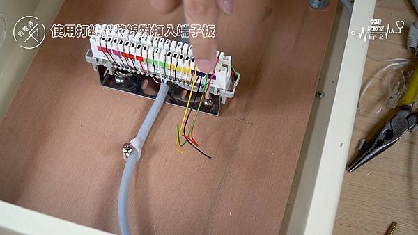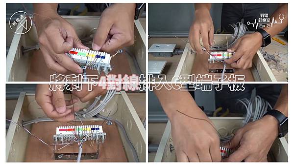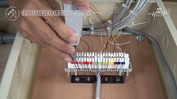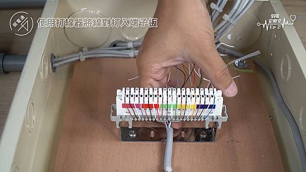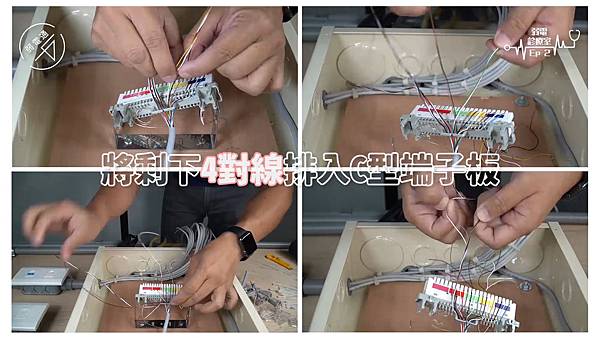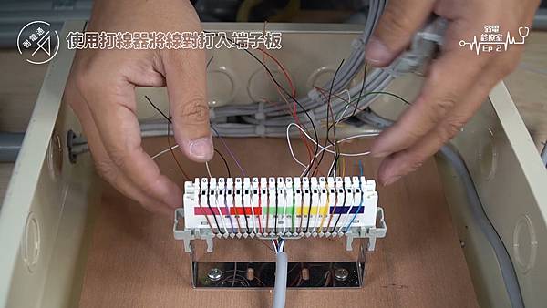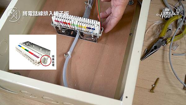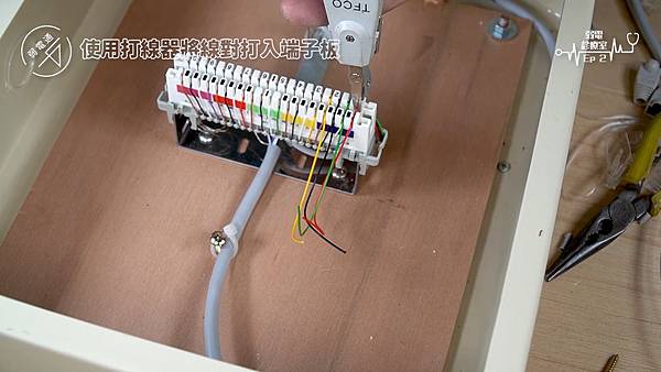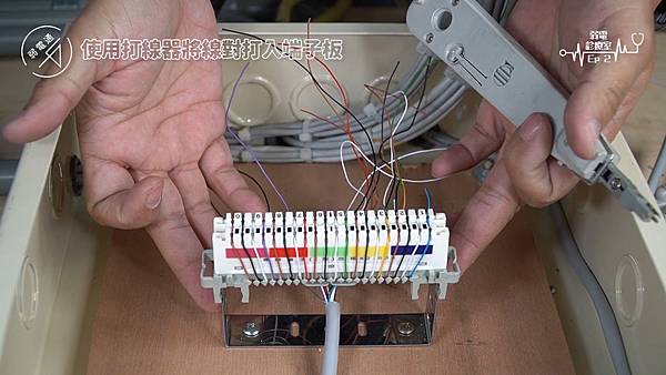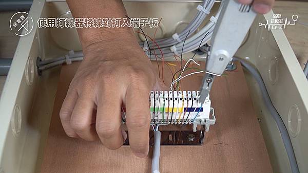 (將四對電話線使用打線器打入端子板)