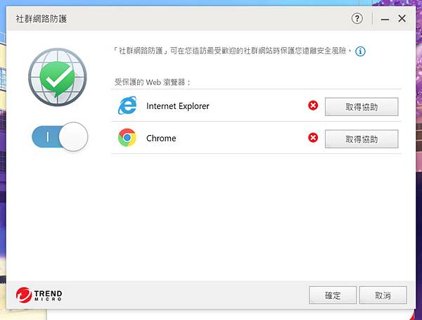 另外瀏覽器的部分要是沒有正確受到PC-cillin 2018雲端版保護時會呈現X的狀態,這時可以參考旁邊的取得協助會有詳細的步驟。