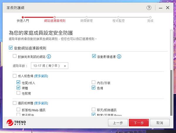 不過還是要把該做的基本家長防護給他設定下去,這邊可以看到主要是針對色情部分。