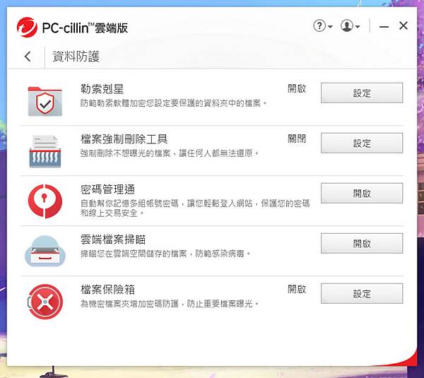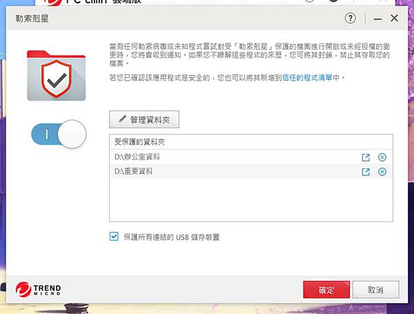為了防範勒索病毒把我們努力的成品毀掉於是我們就立刻開啟PC-cillin 2018雲端版的資料防護,裡面可以看到有一個叫做勒索剋星的功能。