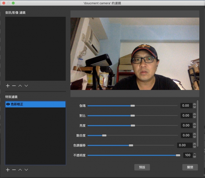 並不是每一支usb相機都會開放所有的參數您買usb羅技攝影機,應該是會將所有的影像參數都開放出來但也有可能只開放部分的參數可以調整如果usb相機的參數沒有開放調整,仍然可以透過OBS的內建設定去調整滑鼠右鍵"視訊裝置"的位置 ,選擇濾鏡新增 色彩校正 色彩鍵 銳化 三個參數比如 色彩校正,就可以調整參數了