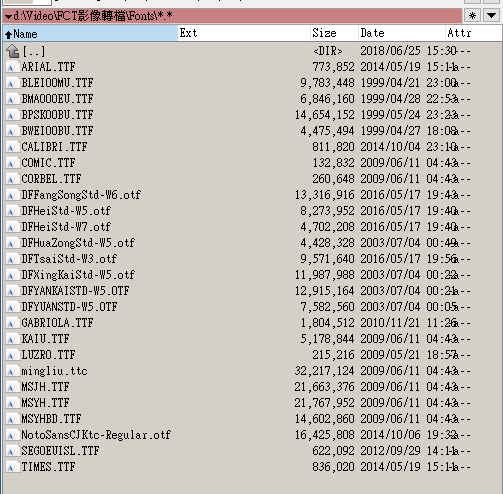 格雷迪 wrote:去調整字幕的字型再用"FCT影像轉換"去做轉換因為我猜是自己電腦沒有字幕檔所用的字型..下方勾起原始字型就好了...(恕刪) FCT 有自己的 font 目錄, 它好像會自己解 ttf 檔, 自己 render 字型. 而非叫系統畫字.你可以把 ass 所需的 ttf 檔, 丟在 FCT 的 font 目錄裡面..ass 也可以用 筆記本之類的 text editor 開, 直接改 字形名稱 ..