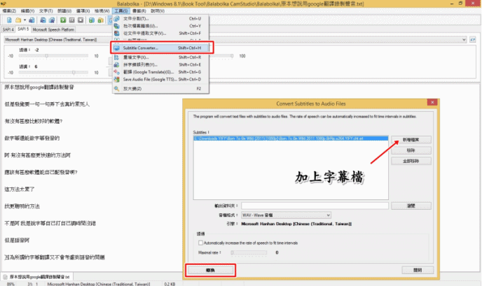 惡魔印記666 wrote:應該是我前面說的Balabolka...(恕刪) 基本上以前也介紹過.不再問.當然不會說下去.問的簡單.回復却要花時間.https://www.mobile01.com/topicdetail.php?f=509&t=4713919http://www.mobile01.com/topicdetail.php?f=512&t=4154095然後再手動貼上.手動貼上語音.當然影片越長.花的時間也越多.gregji121 wrote:這是甚麼軟體...(恕刪) BalabolkaWin7要看看 上面連結有介紹..Balabolka 另一做法.超快.連時間軸.把做好的字幕加入.這是你最想要的.支持 srt..ssa.ass.當然字幕也要整理好.男女聲不分.