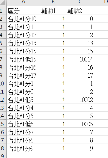 as123456k wrote:只是台北#1分1 台北#1分10 台北#1分2,10會跑到2前面不會接到9後面.(恕刪) 我試沒問題喔也許是儲存格格式不同??也許是您的"真實資料"比您問的,更複雜??唉,一下1個字,一下變2個數字,就不能給個正確的測試用資料嗎?