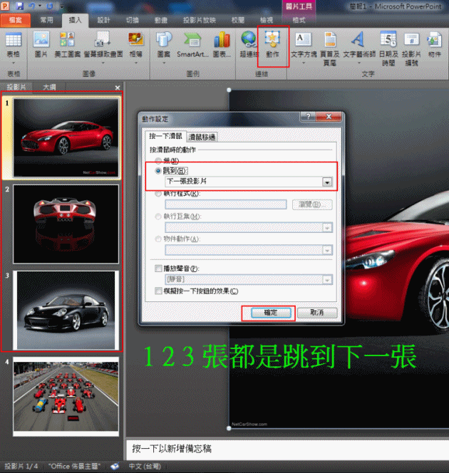 ((((急救!!!!!))))想請教PPT達人在一張PPT裡的左半部要Run照片編號1.2.3.4.5.跑完編號1.2.3.4.5一直到按滑鼠下一張ppt出現結束請問這樣要第一輪跑完要跑第二輪 這樣如何設定呢???我現在用的是office 2010希望有善心人士可以協助啊 謝謝非常急非常急!!