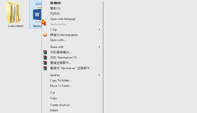 scott790821 wrote:不知道按到什麼了不管...(恕刪) 重置恢復到默認值OFFICE 2007 2010 2013 全部適用..第一歩首先要顯示隱藏文件..要不然你看不到 AppDataC:\Users\用戶名\AppData\Roaming\Microsoft\Templates找到normal.dotm 把他刪除第二歩RUN 輸入regedit 在以下位置.找到Data 右點删除….重啟 WORD 會自動重建 normal.dotm 及 DataHKEY_CURRENT_USER\Software\Microsoft\Office\15.0\Word\Data開啟 WORD 再重新設置重新設置(更改 Normal 範本).最好是右點 normal.dotm 開啟..設置完後(保存檔案)便可(不是另存新檔)..毎次打開新檔都是一樣..