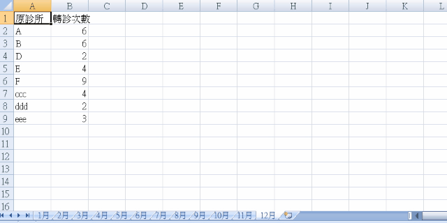 excel 內 有數個工作表(按月份分)及 excel A欄為[診所名稱]、B欄為[轉診次數].
