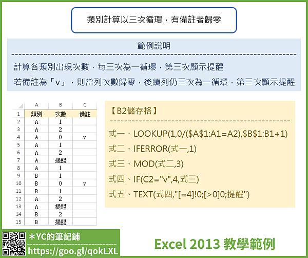 joblyc017 wrote:計算重覆次數為3時...(恕刪) 您好:您的公式,小弟測試後完全符合我的需求,非常感謝您。冒味再請教一下,您的公式我當時測試時不使用 TEXT 來格式化,使用 IF 來寫發現您的公式次數是以 1, 2, 3 的方式呈現,而我的公式會變成 0, 1, 2 的方式來呈現。您的方法是完全符合我的需求,只是我不確定我的公式哪個環節有問題……