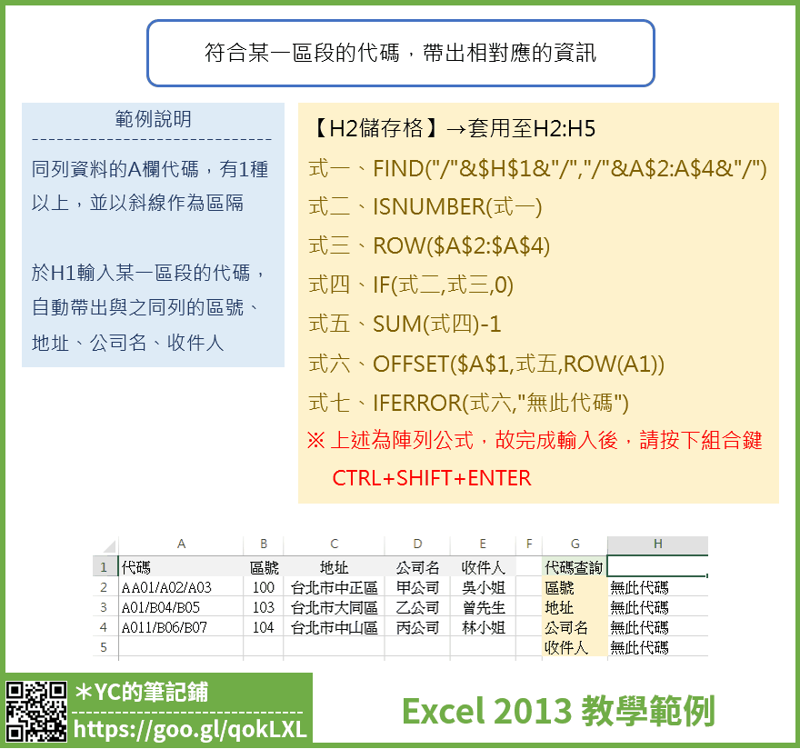 謝謝 joblyc017 的幫忙。但是我照著公式做法卻代不出資料,不知道是哪邊出了問題,如下圖。H2是完整公式鍵入,然後下面H9~15是分解一~七的公式。joblyc017 wrote:公式詳解,請參考:https...(恕刪)