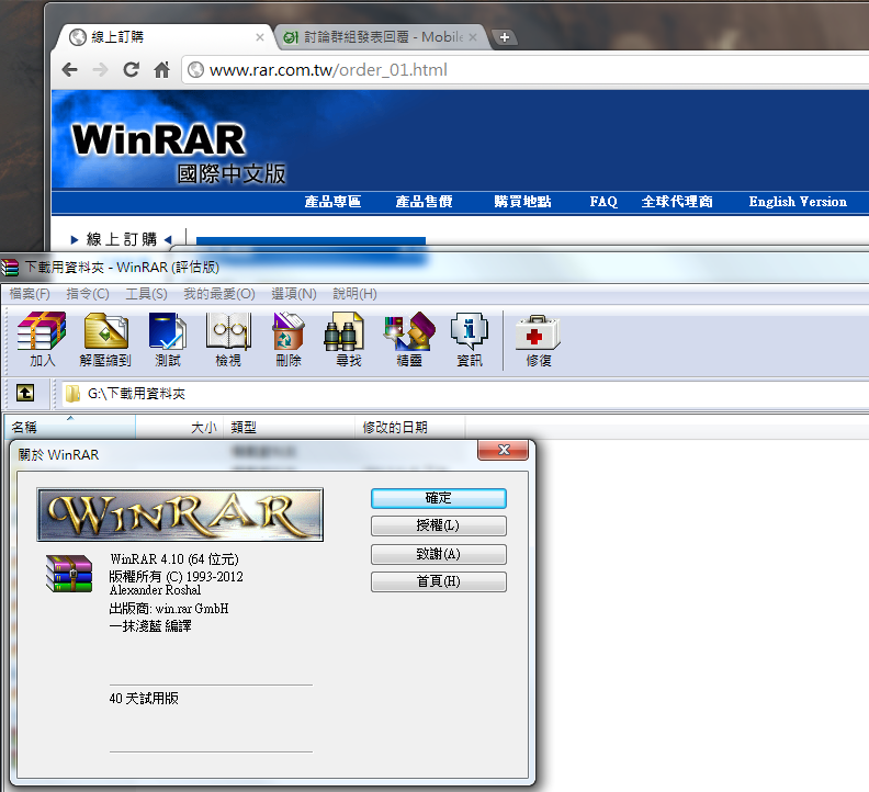 ff7 wrote:試用40天40天之後每次進入winrar都會要求購買授權但不買授權還是可以繼續使用如果沒有付費買授權winrar就會顯示"評估版" 有叫你付錢就不是免費版而且還要忍受每次一開啟WINRAR就出現叫你付錢的視窗既然有開放原始碼,免費,壓縮率更好的7-ZIP何必再忍受WINRAR的付費視窗而且7-ZIP也可以解壓縮RAR壓縮檔