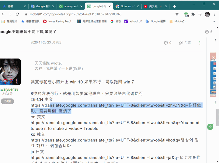 其實你花幾小時升上 win 10 如果不行、1個月內可以還原跑回 old win 7 https://www.mobile01.com/topicdetail.php?f=300&t=5958624&p=4 8樓的方法可行就先用、如要其他語言、只要改語言代碼便可 zh-CN 中文 https://translate.google.com/translate_tts?ie=UTF-8&client=tw-ob&tl=zh-CN&q=你好做影片需要用到~麻煩了 en 英文 https://translate.google.com/translate_tts?ie=UTF-8&client=tw-ob&tl=en&q=You need to use it to make a video~ Trouble ko 韓文 https://translate.google.com/translate_tts?ie=UTF-8&client=tw-ob&tl=ko&q=영상이 필요 해요 ~ 귀찮습니다 ja 日文 https://translate.google.com/translate_tts?ie=UTF-8&client=tw-ob&tl=ja&q=ビデオを作るためにそれを使う必要があります〜トラブル