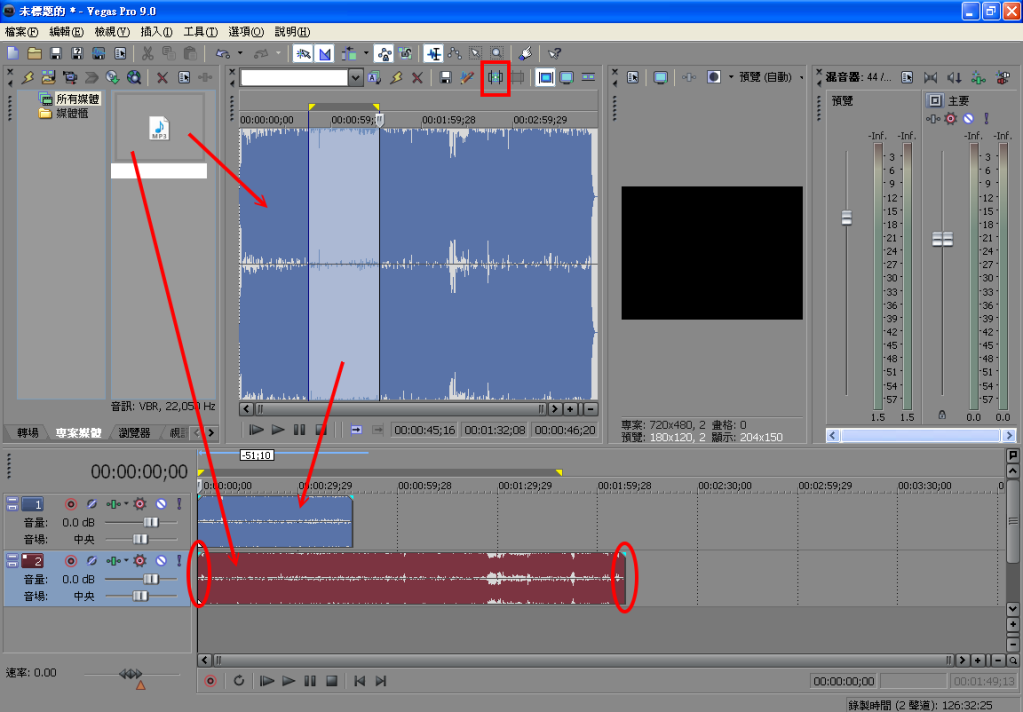 用vegas剪音樂會不會太肥了點來看圖說故事,不知9版和10版有沒差很多....加入的檔案會在左邊專案媒體那裡這時可以拉到右邊修剪器視窗,選取範圍後直接拉到下面,或是選取的範圍要用到好幾次的話可以建立子素材專案媒體那裡的檔案也可以直接拉到最下面最下面那個視窗裡的音軌也可以只取某個範圍(紅圈圈起來那裡按著就可以拉)反正方法很多,搞的出來都行編輯好之後再選建構,選要存的格式和名稱就可以匯出了