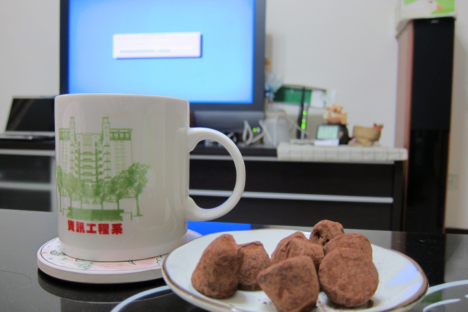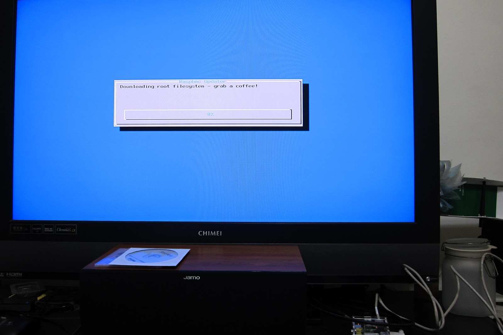 接著轉換戰場,把SD卡裝在Pi上,接上USB的滑鼠鍵盤,HDMI接上螢幕,網路線插上,一切備妥之後,再接上USB,Pi開機後,就會接續安裝Raspbmc,因為接下來的部份Pi會自動完成,所以可以去泡個咖啡,現在!配著沒有松露的松露巧克力。=.=