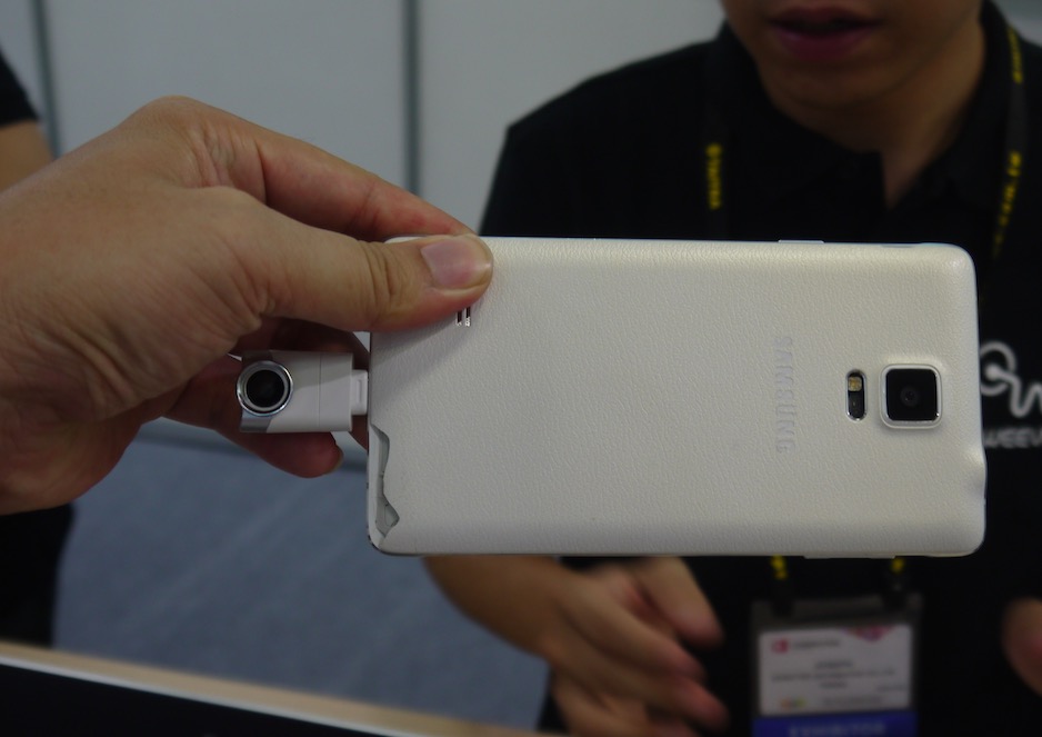 攝影機有一個磁鐵,可以吸附在手機或平版背部,然後用無線或有線連接至平版