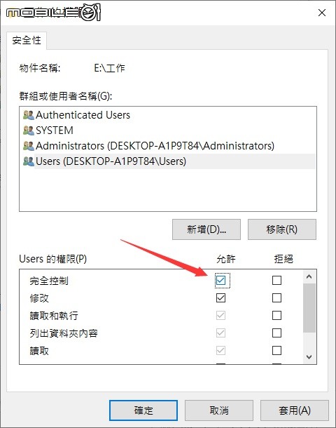 步驟 4: 在“組或用戶名”框中,單擊您的帳戶名。然後,在“用戶權限”框中,選中“完全控制”的“允許”(這將允許您完全控制訪問和修改此檔案和資料夾)。之後,單擊“確定”以應用更改。