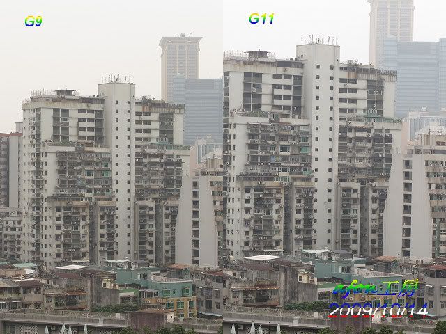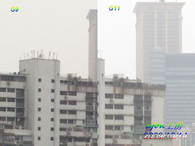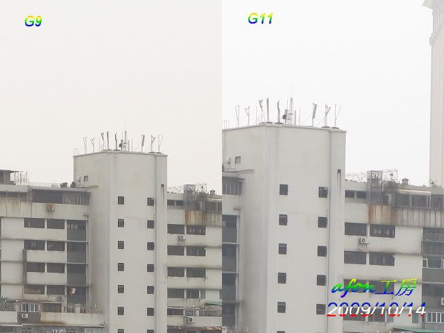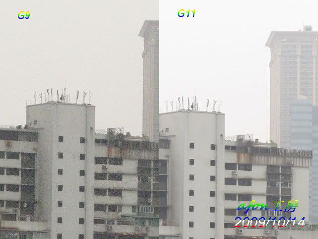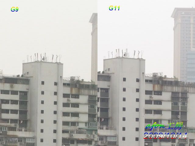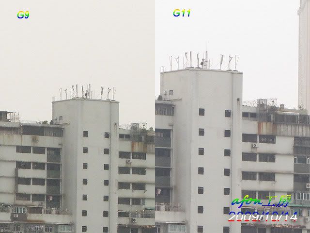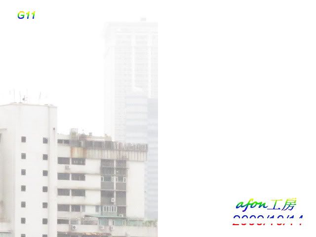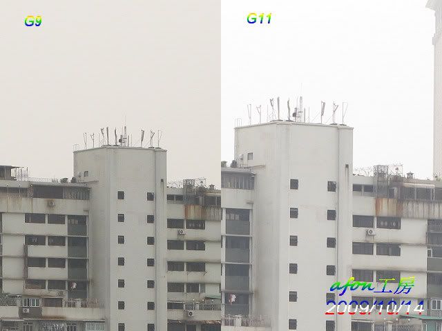 由於G11仍是滾熱熱的,所以設定尚未到位。用兩機拍了一個遠景,照片的設定是:白平衡--陰天光圈:5.0拍攝模式:光圈先決先來一張原照片,ISO是80。接著是各級ISO的對比照:ISO80ISO100ISO200ISO400ISO800ISO1600ISO3200驟眼看來,G9的照片好像比G11的好,那是因為G9的色彩是設在艷麗,所以似乎較亮麗。從ISO200開始,G9的照片就似很粗糙,而最尾的ISO3200更是G11獨領風騷。afon
