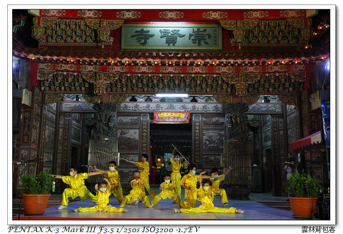 節目一開始,精彩的西螺七崁國小武術表演,大光圈不失銳利度,高ISO凍結表演者的動作,亦不需要閃燈輔助。