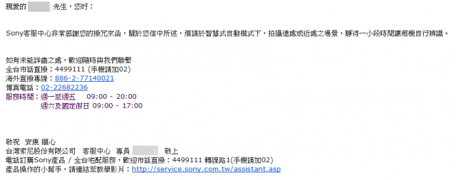 我把這問題留言在Sony網站客服信箱詢問,結果,收到這樣的回覆...「Sony客服中心非常感謝您的撥冗來函,關於您信中所述,煩請於智慧式自動模式下,拍攝遠處或近處之場景,靜待一小段時間讓相機自行辨識。」這種客服實在是讓人無言...