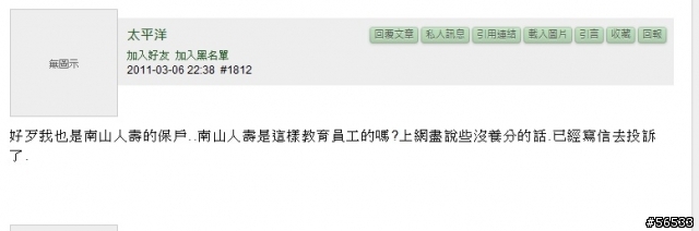 好歹我也是南山人壽的保戶..南山人壽是這樣教育員工的嗎?上網盡說些沒養分的話.已經寫信去投訴了