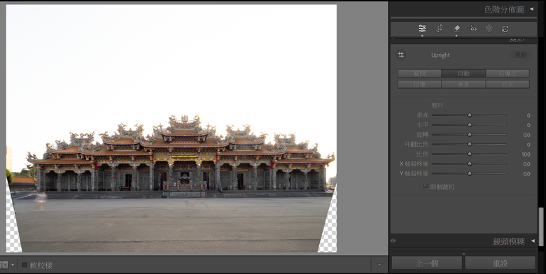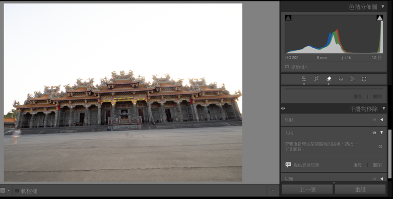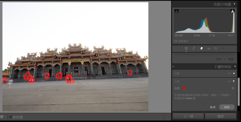 享受科技以後我拍建築物不用使用慢快門讓人變模糊直接移除路人慢快門留下人的殘影沒被移除廣角鏡修正變形如果勾選限制裁切廟兩側的建築物會被裁切這時候把相片移到PS處理把相片底端缺角用生成填色處理兩側有點糊以後不用慢速快門處理路人竹林山觀音寺OM SYSTEM OM-1 + M.ZUIKO DIGITAL ED 8-25mm F4.0 PRO 手持16mm ISO200 f/16 1.0秒 無裁切