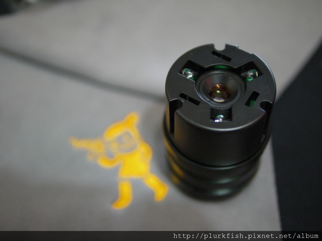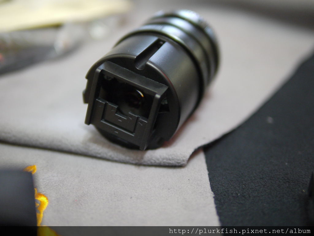 然後鏡頭旁邊的雷射準星LED燈有三顆,是白色光,在鏡頭身上有mini USB的接頭,接上電腦或是任何5V供電的東西都可以讓LED亮,而螺絲起子的功能也出現了,就是可以讓你拆開準星LED燈,不過我是覺得不要開比較好,因為這樣其實剛好可以直接對焦到。