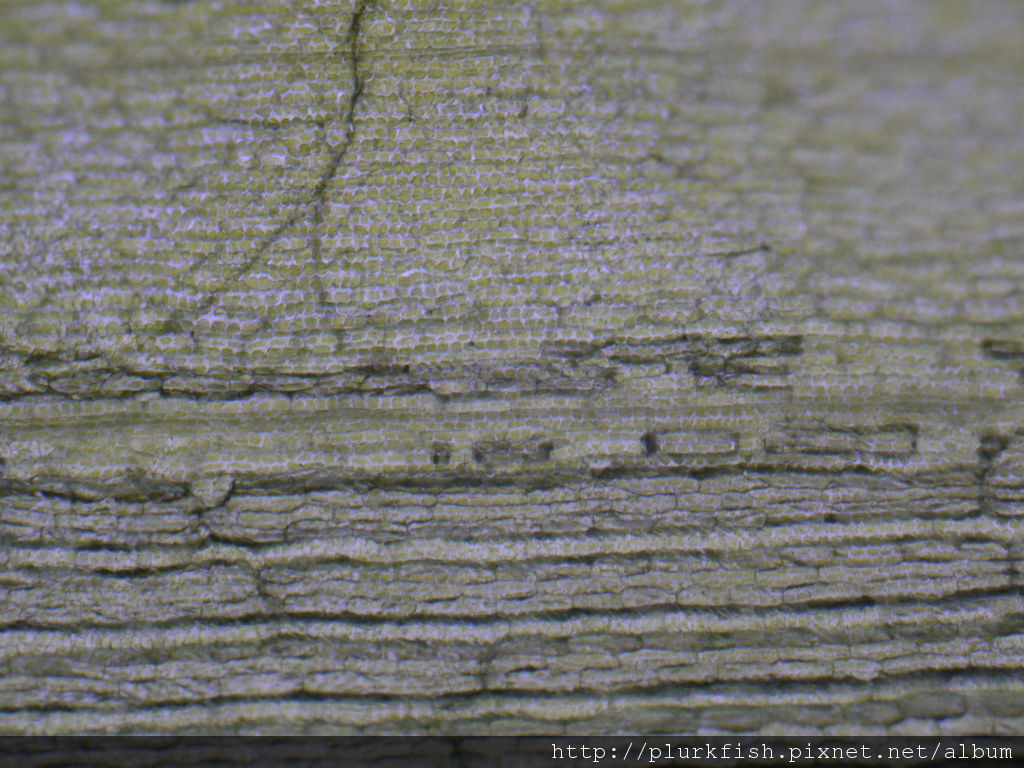 最後一張,我從魚缸裡面拔了一段水草,主要就是想試試看那個架子,然後效果讓我還蠻訝異的,裝上架子後,我先試著拍了幾張,可是一直不滿意,結果突然想到,如果把這鏡頭當作複式顯微鏡拍不知道會怎樣,於是我拿出燈箱(我放在再興了)手機打開了flashlight的app,於是手機面版就亮了起來,所以我拍到了下面這個畫面,可以看到有很多表皮細胞然後也有很多葉肉細胞,由於這個水草本身很薄,我猜他葉肉細胞也沒幾層,所以不同部分就可以看到不同的細胞,上面2/3的都是葉肉細胞,整個綠綠的,中間有一條維管束,下面1/3則是表皮細胞,至於保衛細胞,不好意思,應該剛好沒拍到…XD不過可以拍到這麼可愛的葉肉細胞群,其實我已經很開心了,接下來或許我該處理就是需要弄一個比例尺在手邊這樣,不然這鏡頭拍起來比例尺雖然只在4x跟5x兩個倍率之間,但是總是要注意的啊。(笑)