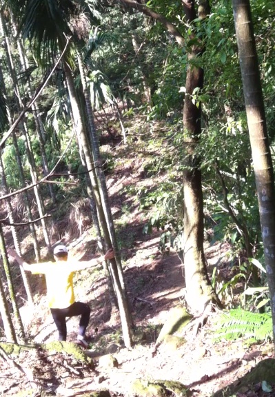 不一會兒,平路的盡頭就到了,接下來是往上的路線, 想了一下, 好吧, 就沿著路跑上去了. 我的媽呀, 一會是土坡,一會是木梯,還有很多石頭參差不齊的路線,樹根,倒木都有.... 不時還有蟲蟲和蜘蛛網來跟你的臉打招呼..... 一路上坡的路線真是讓人吃不消. 需要手腳並用下才能夠順利前進, 步伐也沒辦法太快,其實有時候實在是沒力了,只能用走的. 緩緩的通過陡坡.