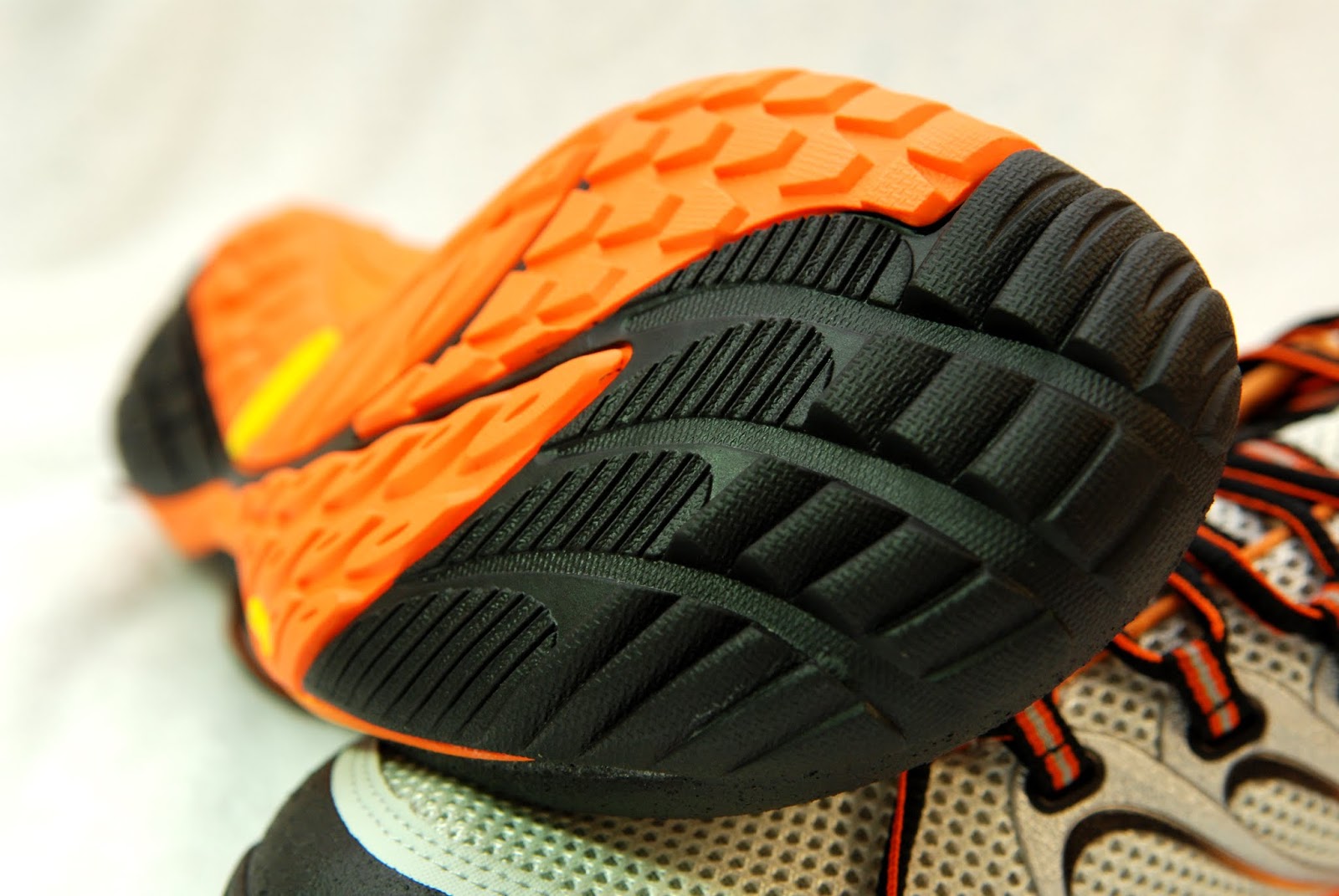來一張正面圖, 外觀上以黑色,橘色和白色作為搭配,在後腳跟上 印了MERRELL的LOGO.