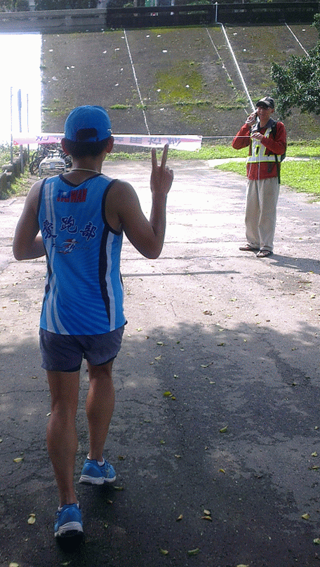 回到終點還是很歡樂,拿了前3名當然是要上凸台啦,看了公園旁有水泥礅,曾sir站上去後變凸台就是頒獎典禮啦!