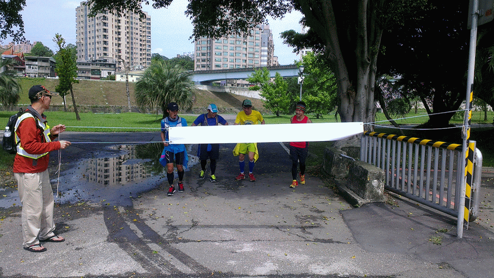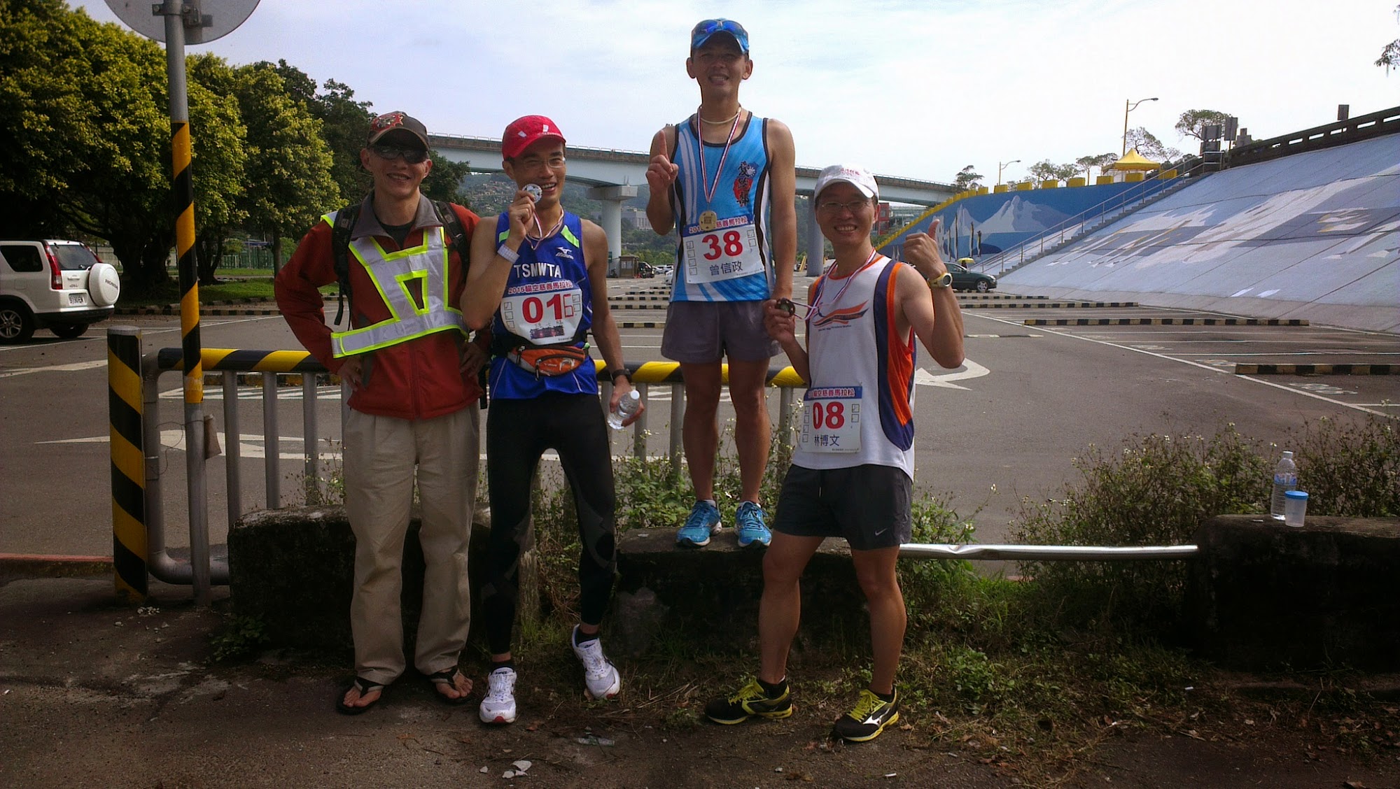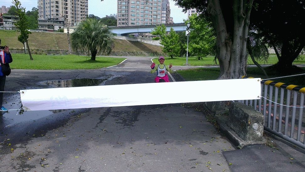 回到動物園前河濱公園,雄哥已經拉起終點線等著我們啦,我跟在曾sir後方衝線,大家都相當開心啊!最後大會完賽成績是4:11:23,總名次2/55,不對啊,我明明是跑總3才對,怎麼登錄的成績是總2呢?更前方不是還有林博文前輩嗎?