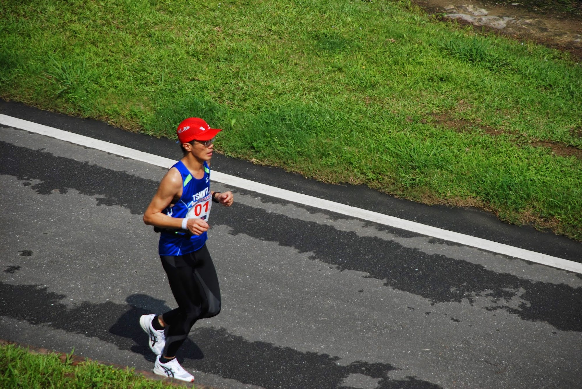 跑馬拉松就是這樣,前半馬都用加法算算自己過了1/4、1/3、1/2了沒,後半段就開始用減法計算離終點還有幾公里…出指南宮後到19K指南路二段三角公園的第2折返點又是連綿的下坡,不過這段路的坡度總算比較舒適一些,我試著將步速加到4分半上下,有幾次我的Garmin Forerunner 220 GPS錶還響起了自訂的破4分速警示,心率還只是輕鬆地跳在160以下;只是硬斗的總是在下坡之後,20K在指南國小附近吃了第二塊小羊羹,快跑滿半馬了,衝啊…呃,前面這坡,就在剛好21K左右,看到一段頗陡的彎路,又看到前方跑總2的跑友已經速度放慢,於是我第一次停下來當步兵,8分半速快走攻克這段上坡…