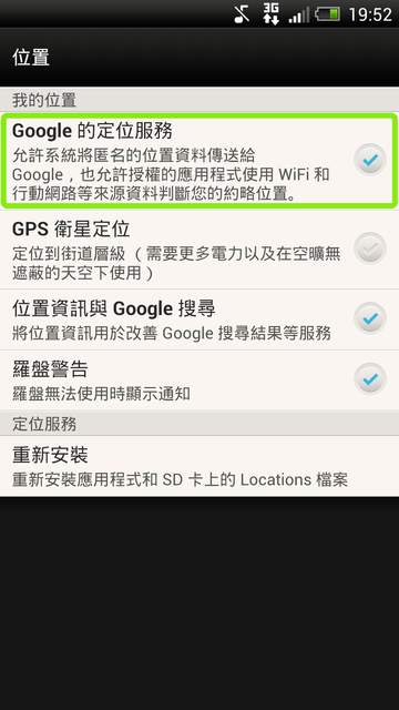 "GPS衛星定位"會非常精確判斷你的位置(誤差5-10公尺),通常是給Google地圖導航或是其他導航程式使用,一般老百姓平時不需要勾選這個項目,因為會消耗額外的電力。