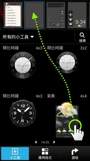 把【氣象】小工具拖拉到畫面上方的空白桌面。右邊圖片上方紅色桌面表示空白格數不足無法容納這個4*4的大工具。
