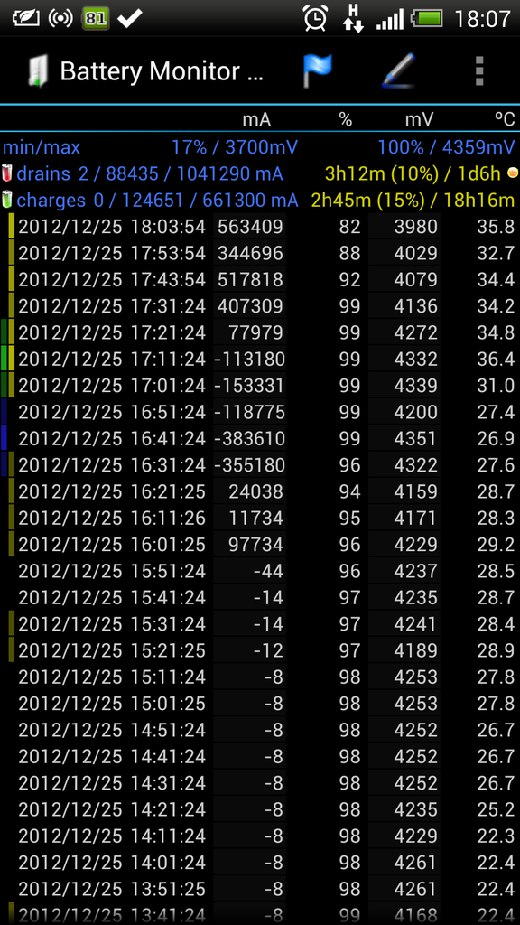 從16:51~17:21這半個小時間就是我上面說的一邊導航 , 另外還開tunein聽台北愛樂 , 還分享網路給ipad mini讓女兒看pps, 溫度最高到36.4而已 , 所以完全不會有過熱問題 , 接下來17:31~18:03這段時間電力下降較快 , 因為它正在接受電力強度測試..呵..