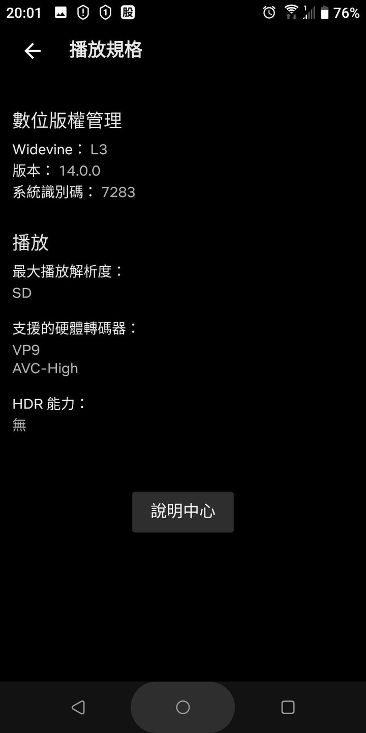 App 中 點一下 [播放規格]。如果您看到 [L3],您就必須聯絡裝置製造商,以確認您的裝置是否支援 Widevine L1。 Widevine L3 裝置只能以標準畫質 (SD) 播放 Netflix。)