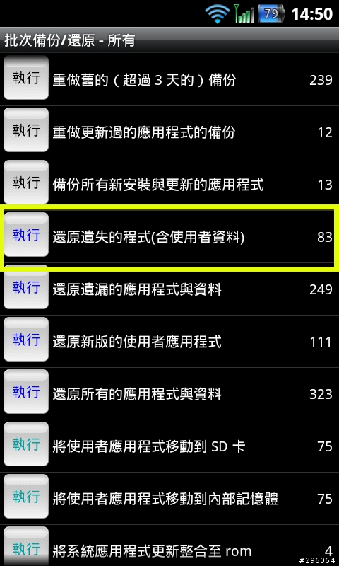 (465)刷Rom 之後...鈦備份還原的注意事項以下應該是基本常識但是還有許多人會犯同樣的錯誤所以在此說明:1. 刷Rom之前... 請用鈦備份軟體menu - 批次 - 備份所有的應用程式與系統資料2. 刷Rom之後...請用鈦備份軟體menu - 批次 (千萬別選 - 還原所有的應用程式與資料)這是錯誤的動作因為你會把舊系統裡面的程式與資料還原到新系統內導致出現一堆別人都不會遇到的怪問題應該要選 (還原遺失的程式 - 含使用者資料)3. 進入後 - 千萬別全選..執行批次操作這樣也會導致部分舊系統裡面的程式與資料還原到新系統內要取消全選張大眼睛認真看只能還原你之前額外安裝過的軟體與程式 (要還原的請打勾)有關系統的程式都不能打勾例如:只有這樣做才不會還原後...出現一堆怪問題------------------------------------------------------------------此外如果要還原Wifi的登入密碼請用先關閉Wifi連線鈦備份單獨還原Wi-Fi 無線網路AP---------------------------------------------------------------------補充說明:刷Rom過程中 或 Recovery 做系統備份與還原過程中...千萬不要插上USB或充電線否則容易產生系統怪異的現象