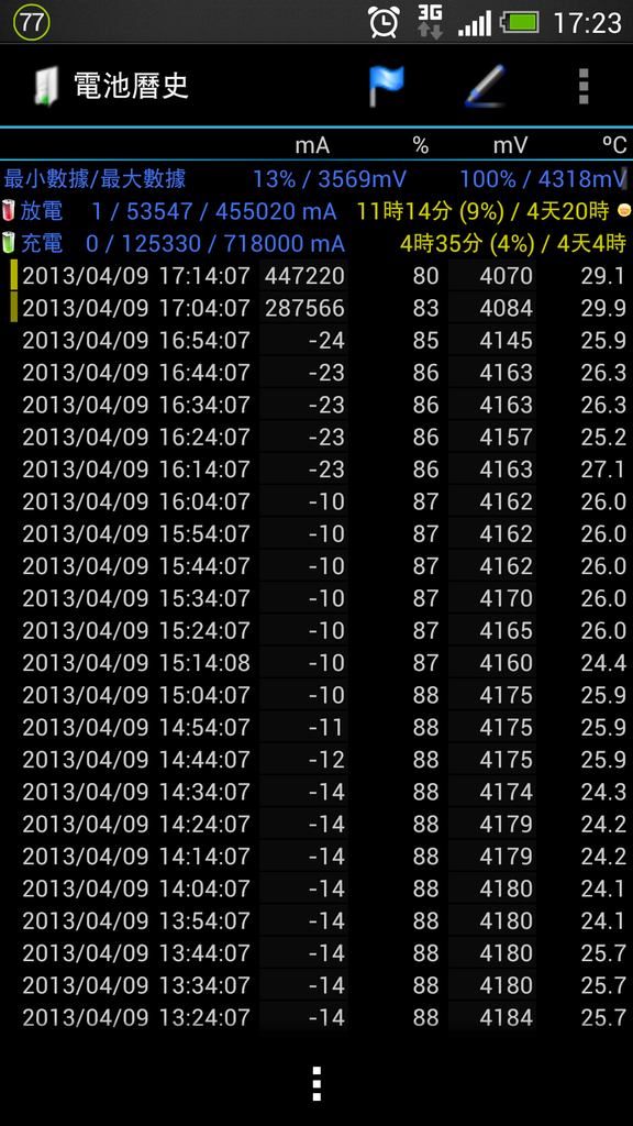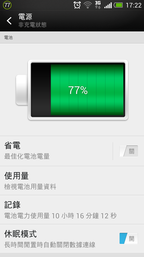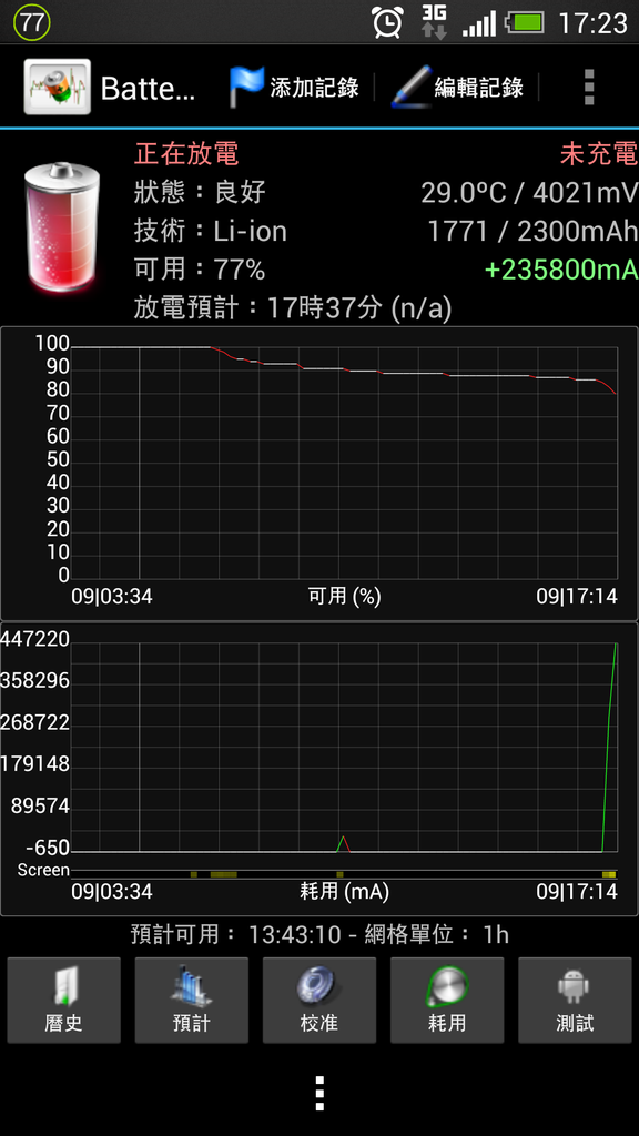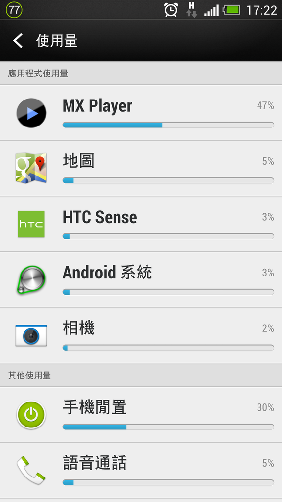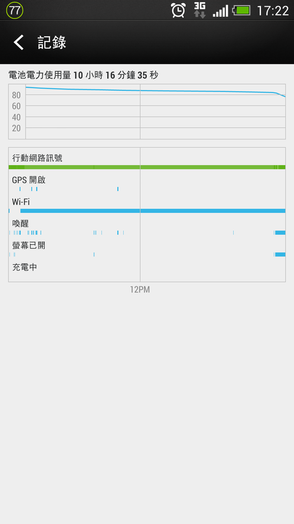 再來看看今天的用量 , 因為是上班日 , 所以少用 , 期間開了20分鐘的網路分享 , 看了20分鐘的影片 , 講了1分鐘左右的電話 , 其它時間都沒有使用(連打開螢幕都沒有)