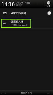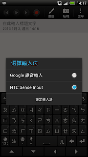 ▼3. 當畫面出現鍵盤時,拉下通知列,就可以選擇其他安裝的輸入法,例如:Google語音輸入或是其他日文輸入法...,當你用注音輸入中文,如果想輸入日文(假設有安裝日文輸入法),拉下通知列是最快速的切換方式。剛剛提到的手指往左滑把注音換成倉頡,並不能換成日文輸入,因為注音、英文、手寫、倉頡都是內建在【HTC Sense Input】,這樣說明清楚嗎?