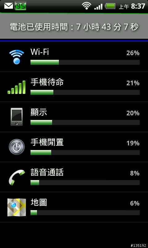 使用版本: IIS V2.0.2 / 0909 修正版昨天晚上重刷 0909 新版 IIS V2.0.2, 設定了兩個 email 帳號, 也在 friend stream 內設定了facebook 及 twitter 同步帳號, WIFI, GPS 和行動網路是開啟的, daemon controller 全預設值, 大約 01:00 am 待機睡覺去, 當下電池電量為 97%, 今天早上 08:07 醒來, 馬上開機, 電池電量顯示為 95%, 7 個小時待機只掉 2%T 大, 會不會調得太省電啦, 爽 電量使用 log 圖, 待機時, 電量線圖幾乎是水平的, 每小時只消耗 0.3% 電量快速設定內的選項, 如果關掉 WIFI 肯定更省電DAEMON CONTROLLER 全預設值這麼省電, 效能不變, 好樣的!結論就是 Incredible SS V2.0.2.0909 修正版 M U S T -- H A V E 同場加映問題回報:GTalk 視訊時, 我們看對方正常, 畫面右下角顯示的己方畫面是轉90度橫向,對方看到我們的畫面也是轉90度橫向.